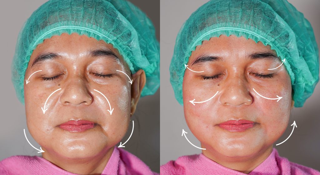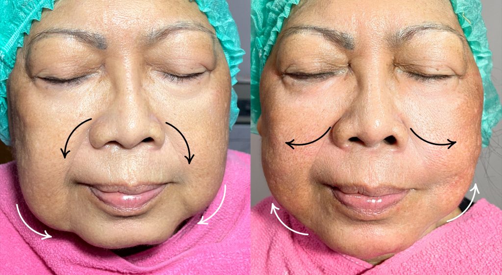 Membentuk wajah tampak lebih tirus dan simetris dengan teknologi pengencangan kulit tanpa operasi. Membentuk garis rahang (jawline) yang lebih tegas, mengurangi lemak berlebih di area pipi atau dagu, mengencangkan kulit yang mulai mengendur, dan menyeimbangkan proporsi wajah secara keseluruhan